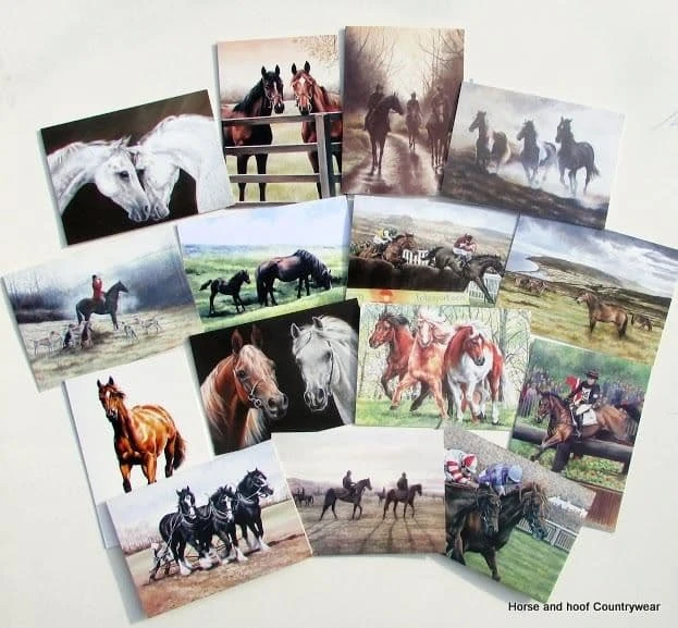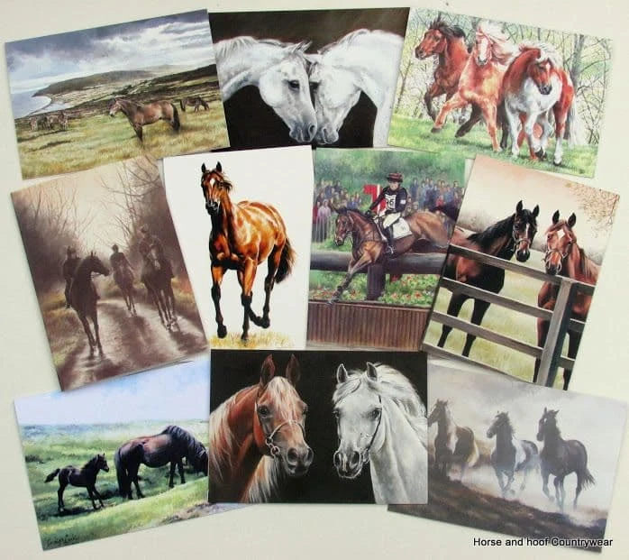 Pack of 10 equestrian cards. All individually wrapped and barcoded. No message inside. Published and printed in the UK. Size: 195mm x 140mm. Designs may vary.