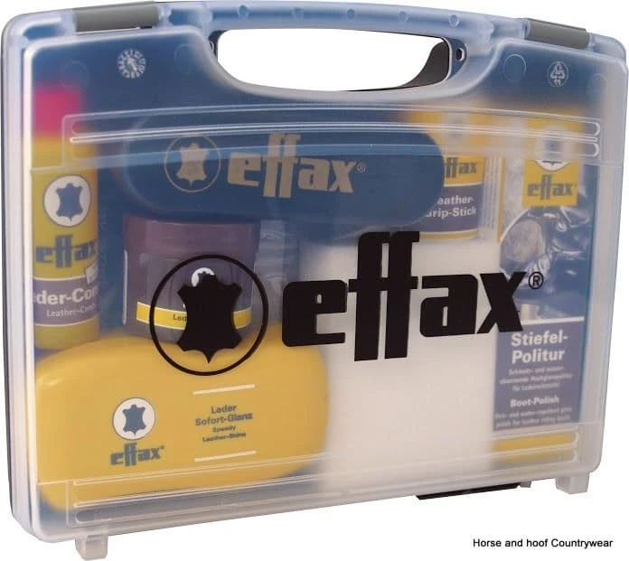 Shoe and Leather care in compact form. The New Effax Leather Care Case contains the perfect care products for riding equipment in a practical case for use when traveling. The high-quality Effax products care for leather whilst cleaning and protecting it against water and dirt. The polishing cloth gives the leather a glossy shine.Â