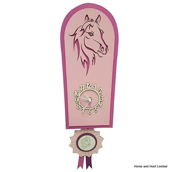 Hand crafted wooden Glamour Horse clock with swinging rosette pendulum. Perfect for a pony mad girls bedroom! Uses silent clock mechanism which will not keep a child awake at night.Â