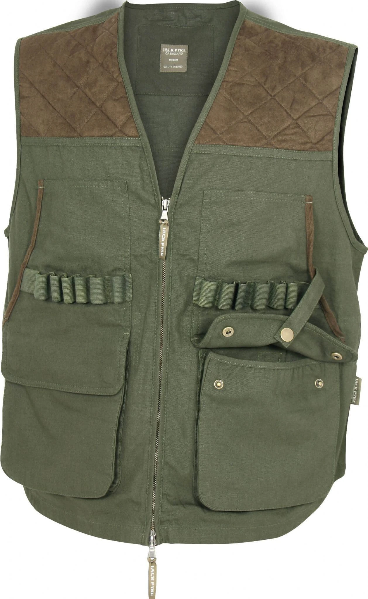 A Heavy cotton canvas vest with suedlite shoulders including large zipped rear game pockets, two large front pockets, two handwarmer pockets and a 12 cartridge holder band.