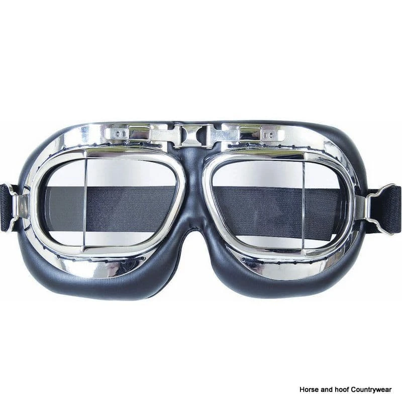 Crome flying goggles come boxed. One Size fits all.