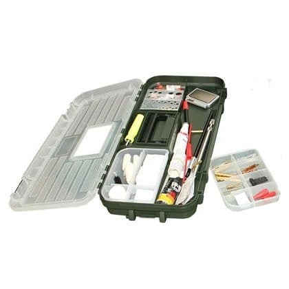 The base or “rifle shotgun cleaning stand” offers plenty of deep storage for supplies and ammo. A pair of adjustable gun forks featuring soft, over-molded rubber padding offers easy positioning of firearms with a firm, non-marring hold. The overall length of the Shooting Range Box provides excellent stability for nearly any size firearm. The bottom base is big enough to hold our largest ammo box the R-100, and most bottles of cleaning solvents will sit up right, without leaks. Made with chemical resistant polypropylene. Size 25″x 11.5″x 8.75″ high. We suggest you read your gun cleaning instructions that came with firearm and maintenance it with the tips they suggest.Â