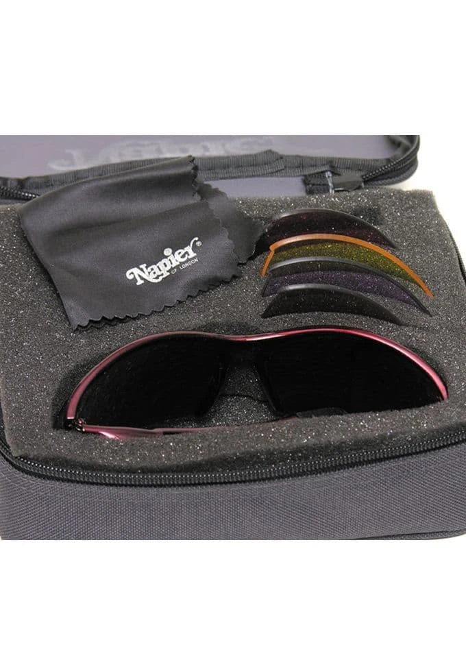 This set includes the best selling Napier A1000 black Pro frame glasses with five interchangeable lenses in yellow, smoke, bronze, vermillion and lilac. The set is together in a soft zip case also including a drawstring bag and cleaning cloth. The lenses are tseted to withstand a shotgun blast at 15 yards. (No 8 shot 32grm 12G)