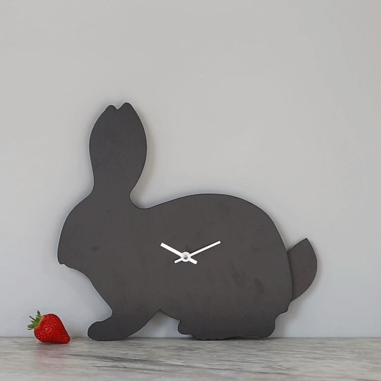 A fun Rabbit Clock with tail that wags on the second. It is made of foamalux board with nickel hands. Can be wall mounted on a nail or propped up against a wall.