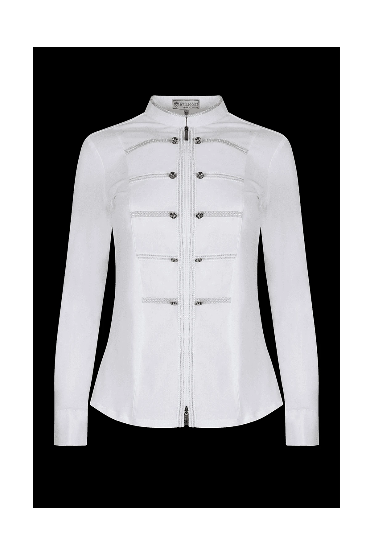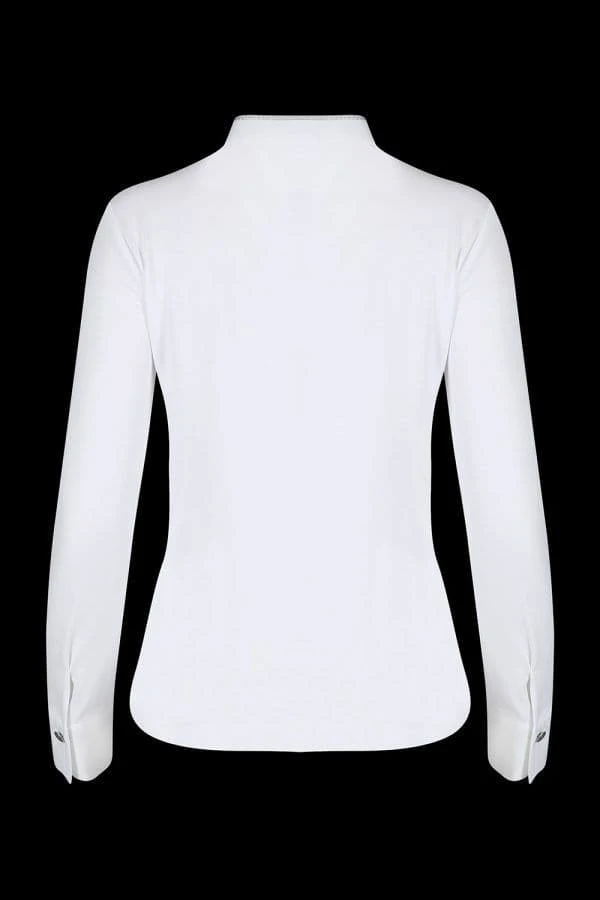 This white 100% cotton durable stretch ladies shirt is flattering and comfortable due to it’s unique tailoring. It features luxurious